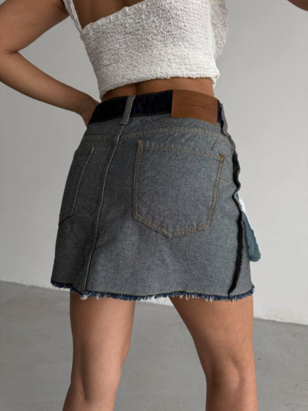Çift Cepli Asimetrik Kargo Denim Mini Etek